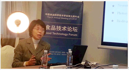 ??????? 我司研發(fā)總監(jiān)姜悅博士應(yīng)邀出席中國(guó)食品科學(xué)技術(shù)學(xué)會(huì)第九屆年會(huì),并與上海交通大學(xué)中美食品安全聯(lián)合研究中心主任史賢明教授共同主持食品技術(shù)論壇(英文)。會(huì)議期間,姜博士作了題為“微藻降膽固醇功效研究”的英文報(bào)告。報(bào)告中姜博士提出,根據(jù)動(dòng)物實(shí)驗(yàn)結(jié)果表明: 潤(rùn)科生物培養(yǎng)的微藻產(chǎn)品是一種可以從根本上促進(jìn)膽固醇排泄的物質(zhì),有很廣的應(yīng)用前景。報(bào)告受到國(guó)內(nèi)外與會(huì)專家學(xué)者的高度關(guān)注和熱烈的討論, 得到與會(huì)者的一致好評(píng)。
