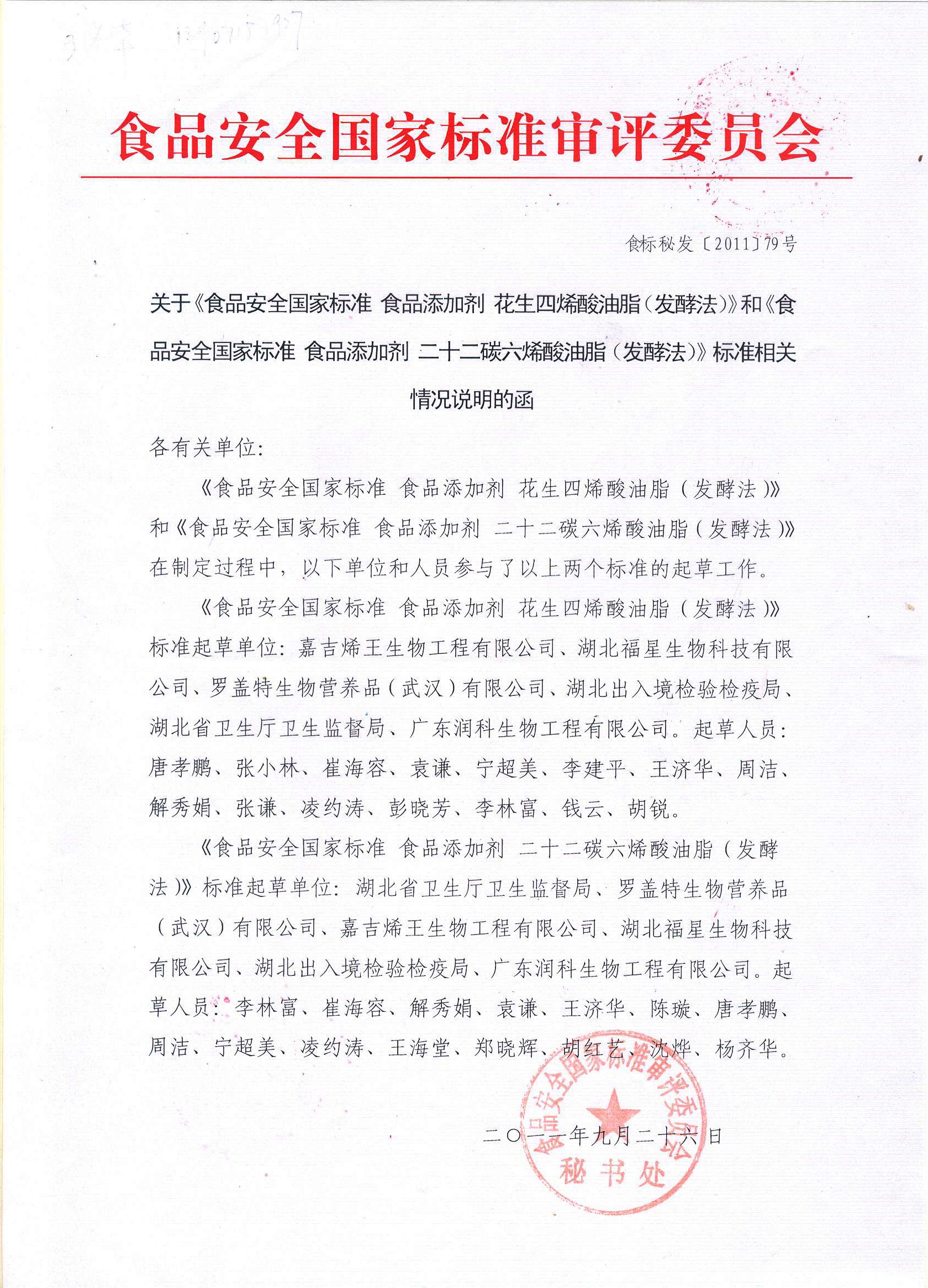 ?????? 潤科生物參與相關產品國家級、行業級標準起草工作,這既是榮譽更是責任與鞭策!2011年9月,公司參與食品安全國家標準審評委員會的兩項國家標準《食品安全國家標準 食品添加劑 二十二碳六烯酸油脂(發酵法)》和《食品安全國家標準 食品添加劑 花生四烯酸油脂(發酵法)》的制定,已在行業中普及使用。