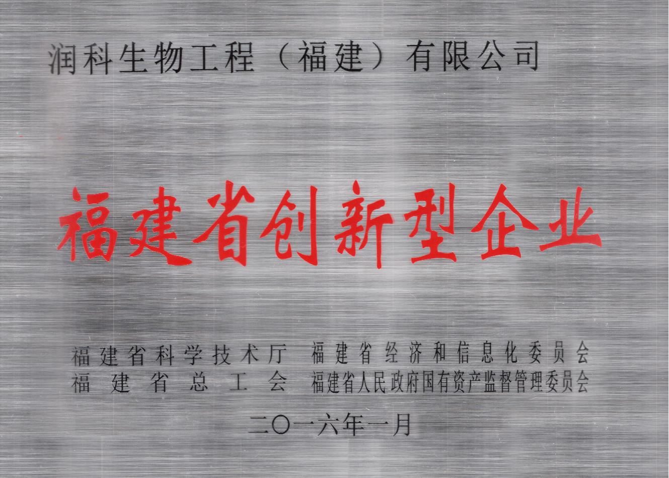 ??????? 2016年1月,福建省科技廳公布第七批共179家“省級創新型企業”名單,潤科生物工程(福建)有限公司獲得福建省科技廳、省經信委、省總工會、國資委正式授予的“福建省創新型企業”稱號,榮登省級創新型企業榜單。
