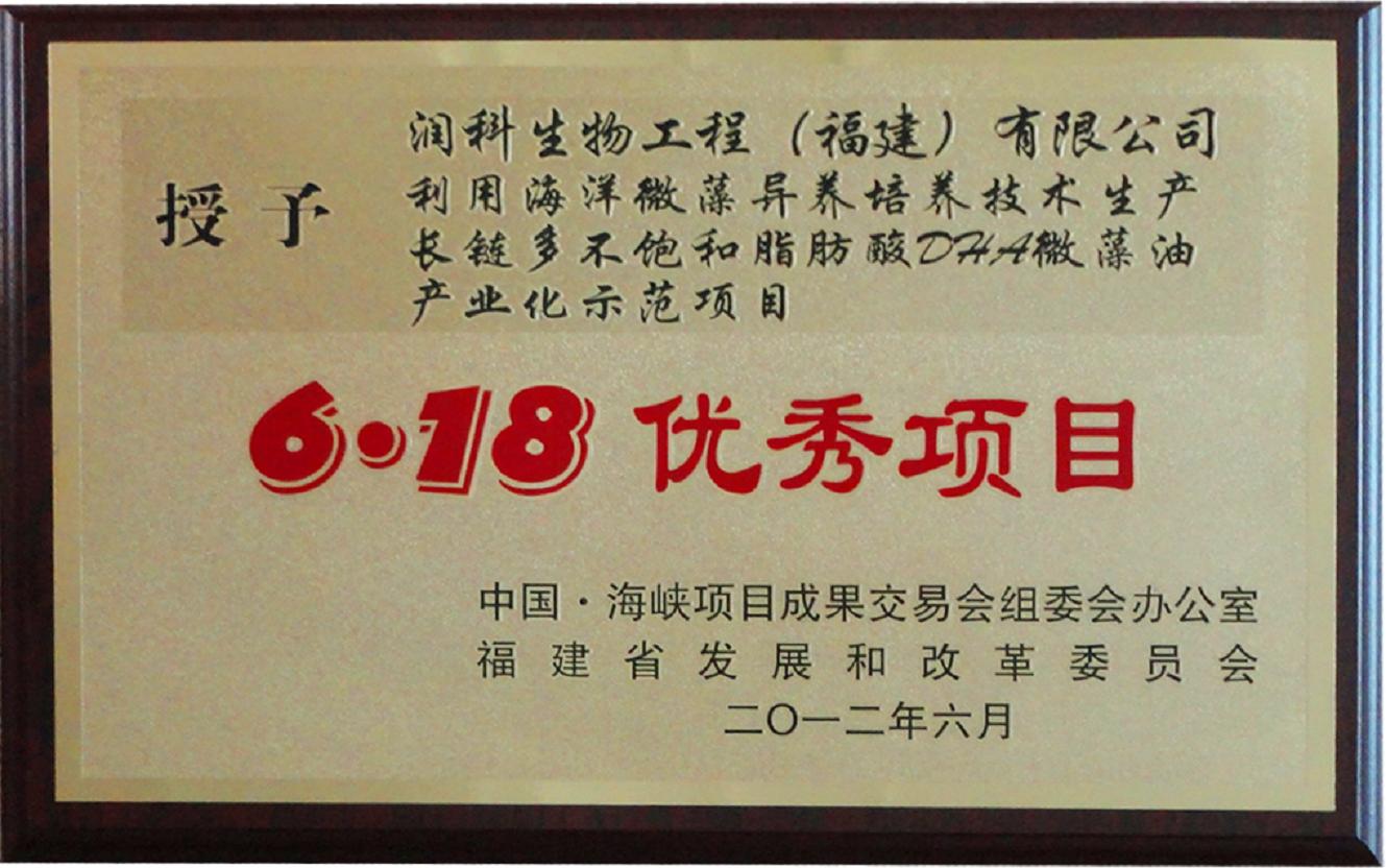 ??????? 潤科生物工程(福建)有限公司研發課題“利用海洋微藻異養培養技術生產長鏈多不飽和脂肪酸DHA微藻油產業化示范項目”被福建省發改委授予618優秀項目。